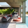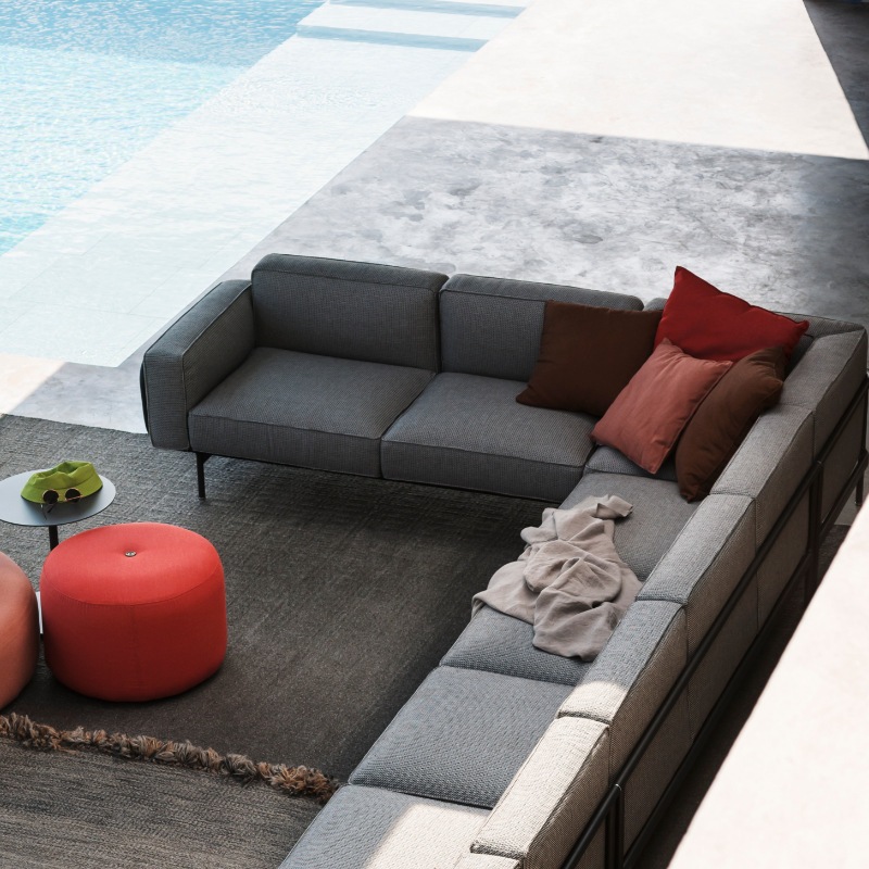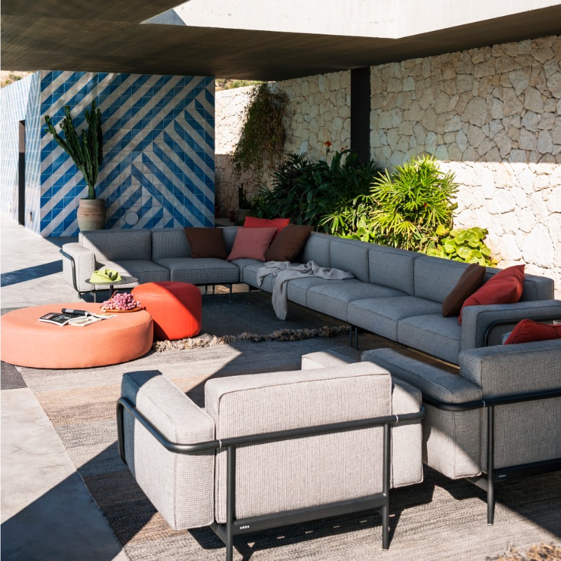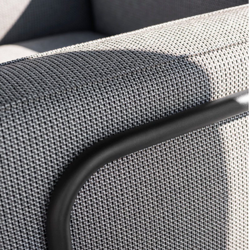 Polster mit Bezügen in verschiedenen Farb-Varianten, wetterbeständige Hydrodränage-Ausführung.