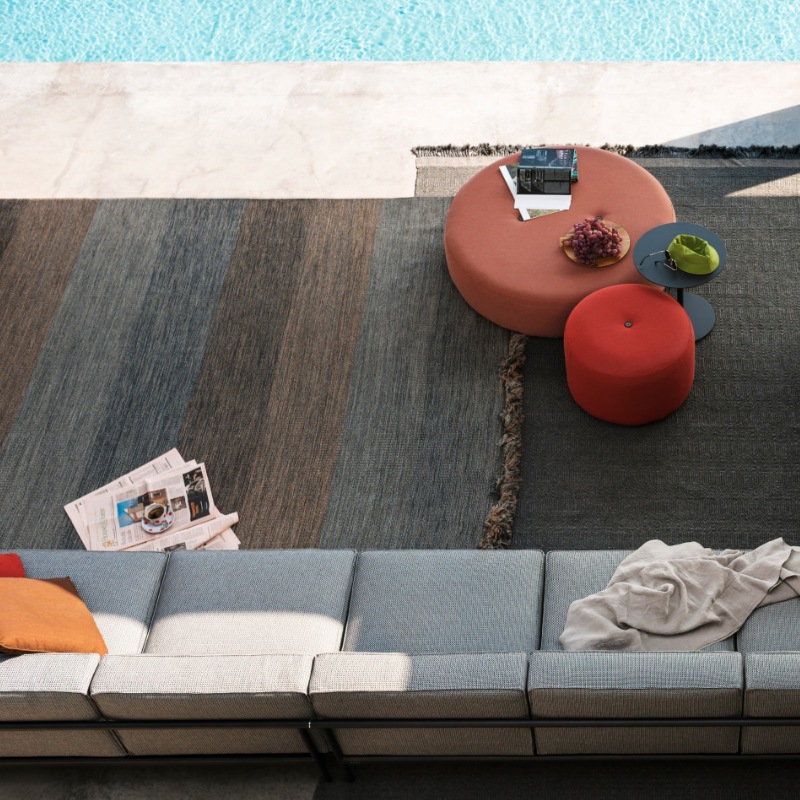Polster mit Bezügen in verschiedenen Farb-Varianten, wetterbeständige Hydrodränage-Ausführung.